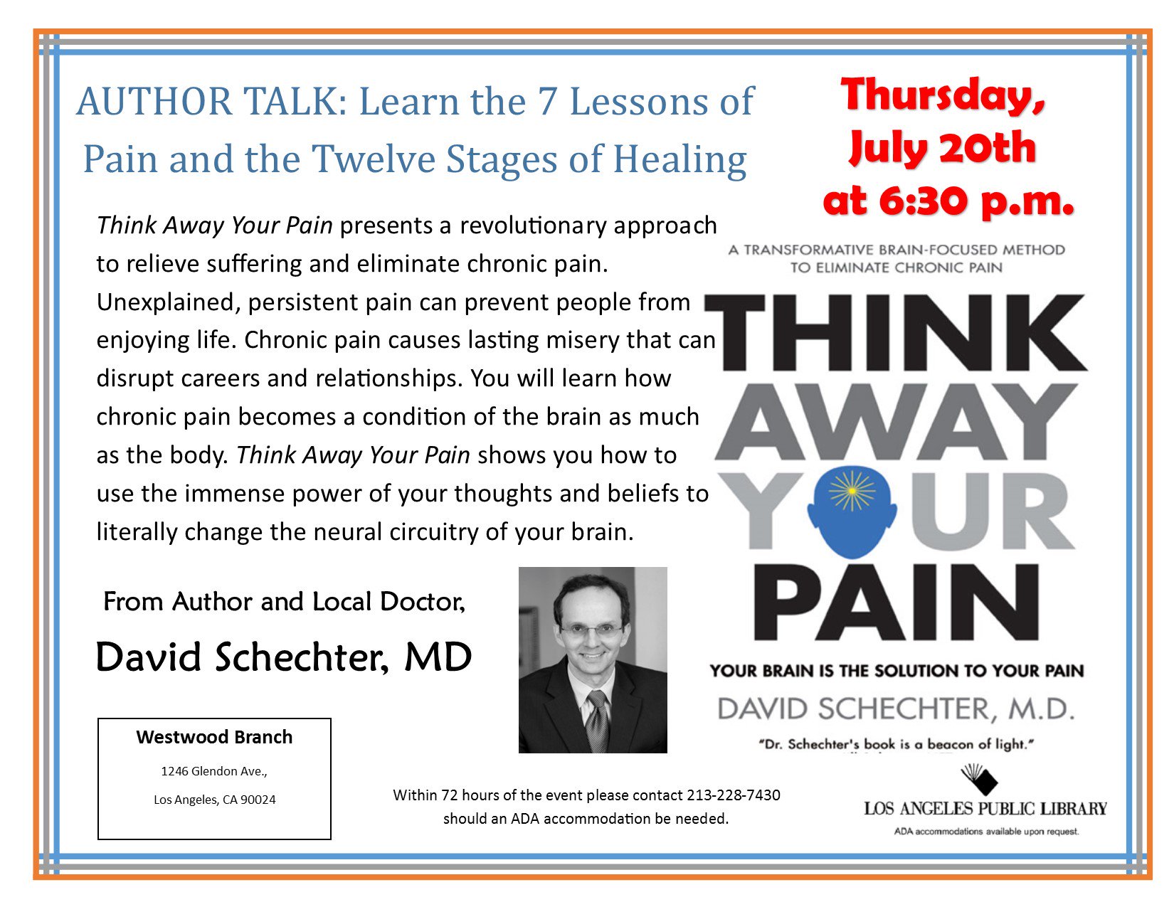 Dr David Schechter On Twitter I Will Speak At Library About Think Away Your Pain 12 Stages Of Healing Seven Lessons Of Pain 1246 Glendon Avenue L A 90024 Th 630p Https T Co Lnygecp9ls